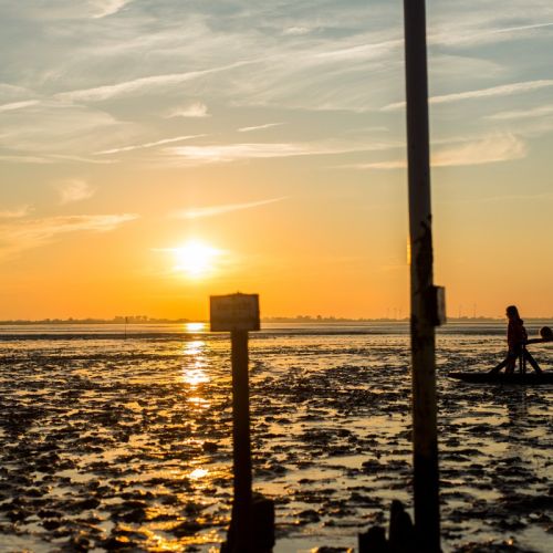 Eine bekannte Wattwanderung, die nur unter kundiger Führung unternommen werden sollte, führt zum Leuchtturm Arngast.