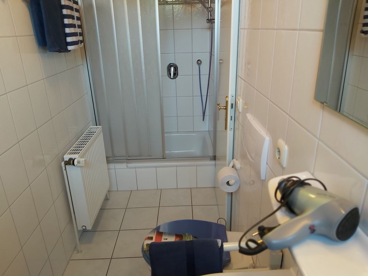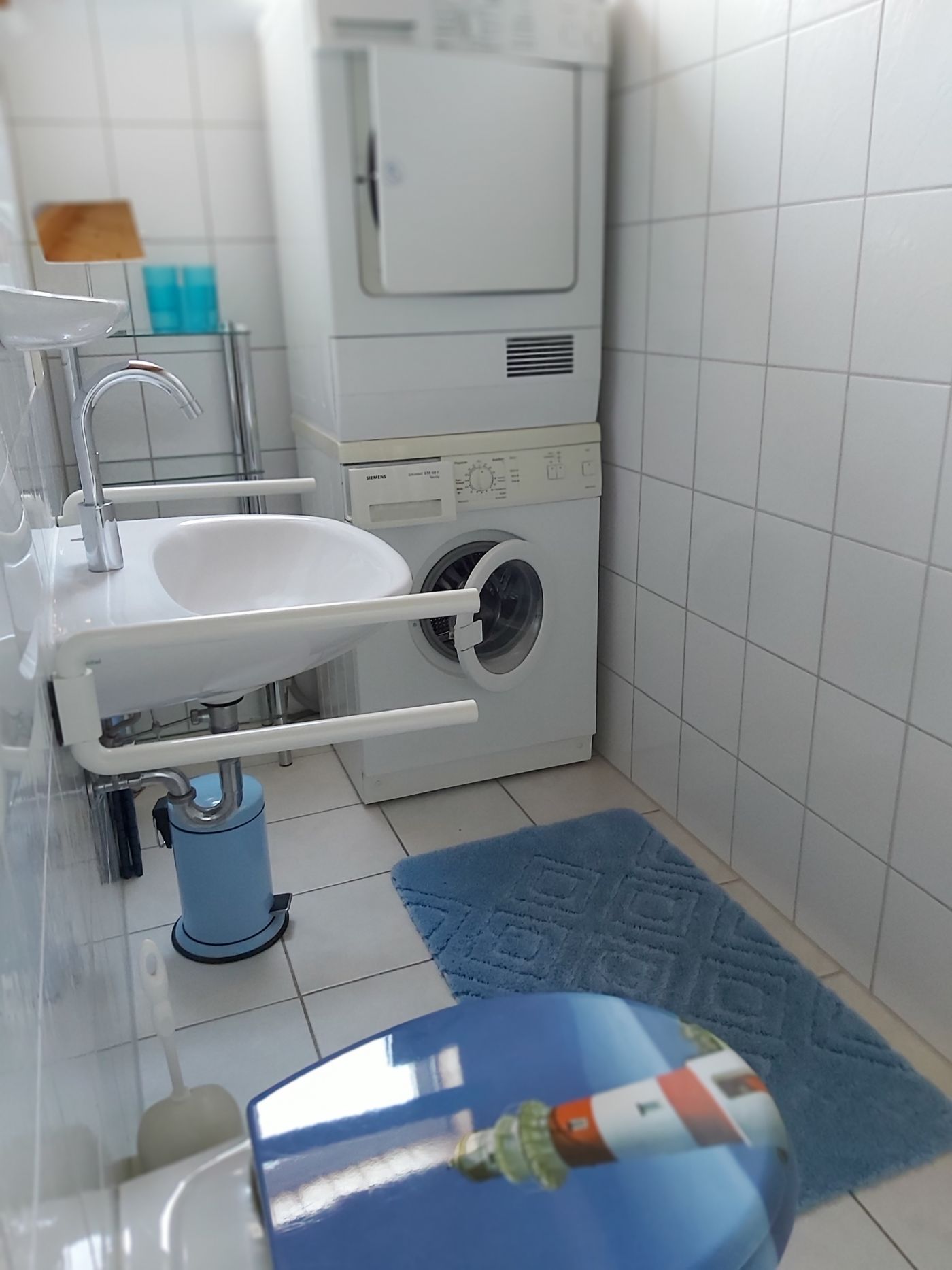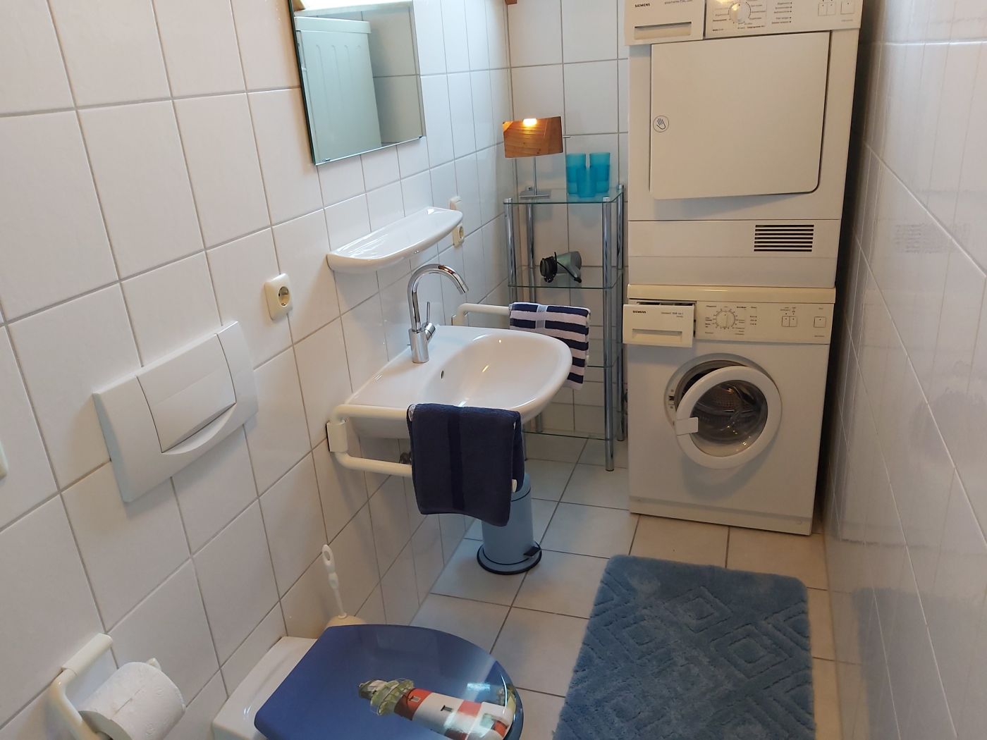 Ein "Gäste-WC" befindet sich im Erdgeschoss und das Dusch Bad mit WC im 1. Stock. Dieses verfügt über eine Waschmaschine, einen Wäschetrockner, Fön und Kosmetikspiegel sowie eine Fußmatte.